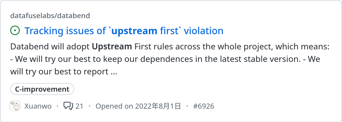 Databend has a large number of common components, and the main binary programs are built on common components, implicitly in line with this optimization idea. In addition, with the support of dependencies inheritance in the workspace, the maintenance pressure has also been reduced.