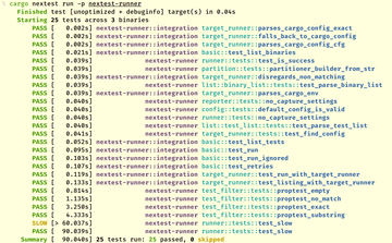 cargo nextest makes testing as fast as lightning and provides finer statistics and elegant views. Many projects in the Rust community have greatly improved test pipeline time by introducing cargo nextest.