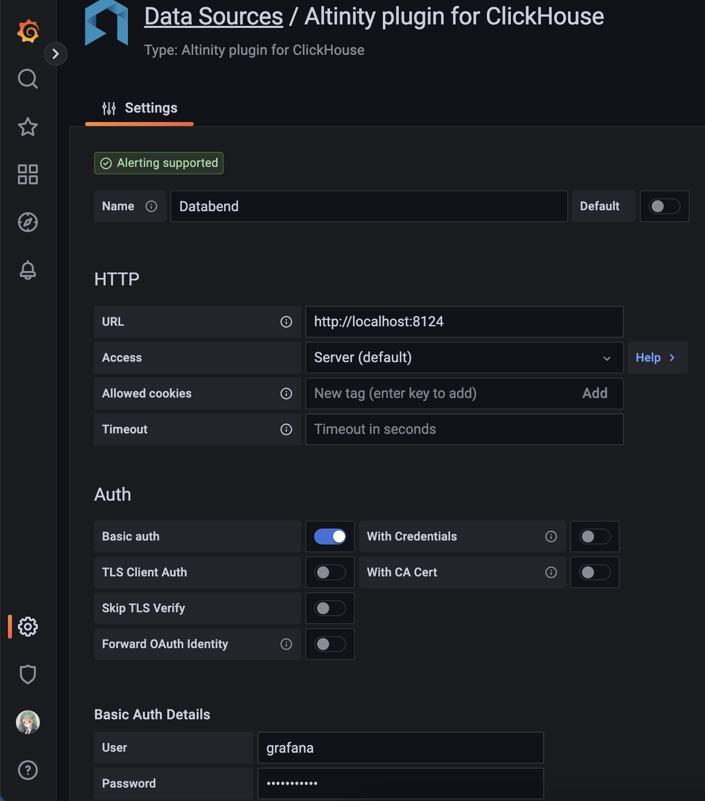 HTTP -> URLYour databend query clickhouse endpoint, for example:http://localhost:8124Auth -> Basic authenabledBasic Auth Details -> User, Passwordpreviously created grafana userAdditional -> Use POST method to send queriesenabled